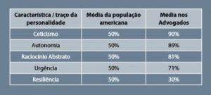 Um ponto importantíssimo que temos que considerar é a psique profissional do Advogado e que é muito bem mostrada pelo estudo estatístico elaborado após anos de observação no mercado americano pela Caliper (www.calipercorp.com). Essa observação gerou o perfil profissional Caliper do advogado e seus desvios em relação à média da população americana, conforma abaixo e publicado no livro “Growth is Dead: Now what?” de autoria de Bruce MacEwen da Consultoria Adam Smith, Esq.