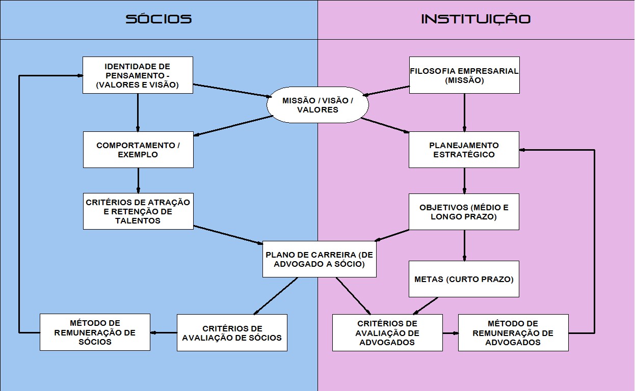 Uma vez definida a filosofia empresarial, o ciclo na entidade “instituição” passa pelo planejamento estratégico, que por sua vez define objetivos e metas. Os objetivos de médio e longo prazo definem o plano de carreira de advogados e sócios e os de curto prazo definem os critérios de avaliação dos profissionais. Esses dois elementos devem retroalimentar o planejamento estratégico para eventuais correções de rumo.